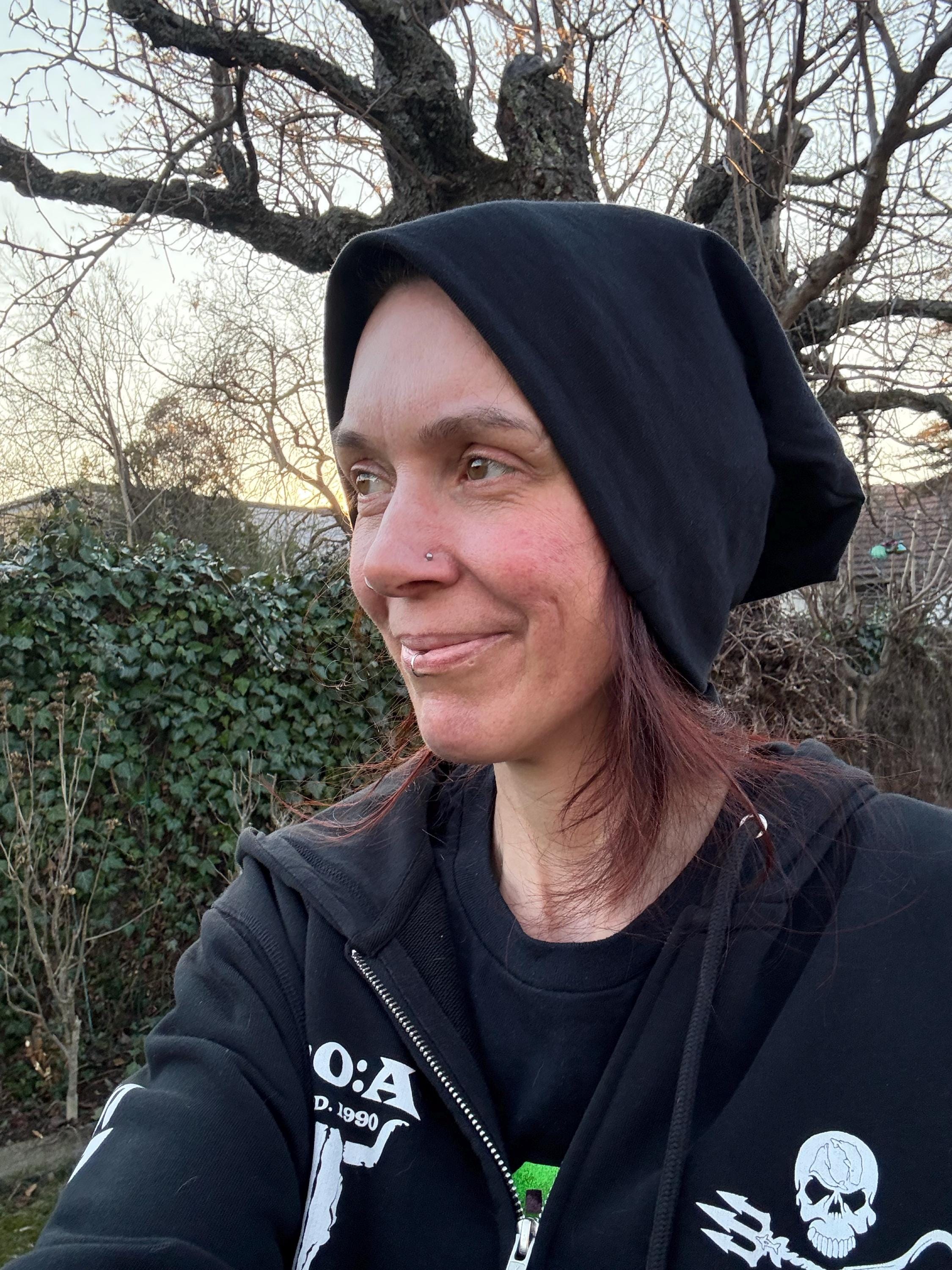 An update on the best-selling slouchy black beanie inspired by everyone's favourite Goth Metal heartthrob, Ville Valo. I've chosen a lighter-weight fabric for this one that is warm enough for winter but can easily fit with an autumn or spring look.